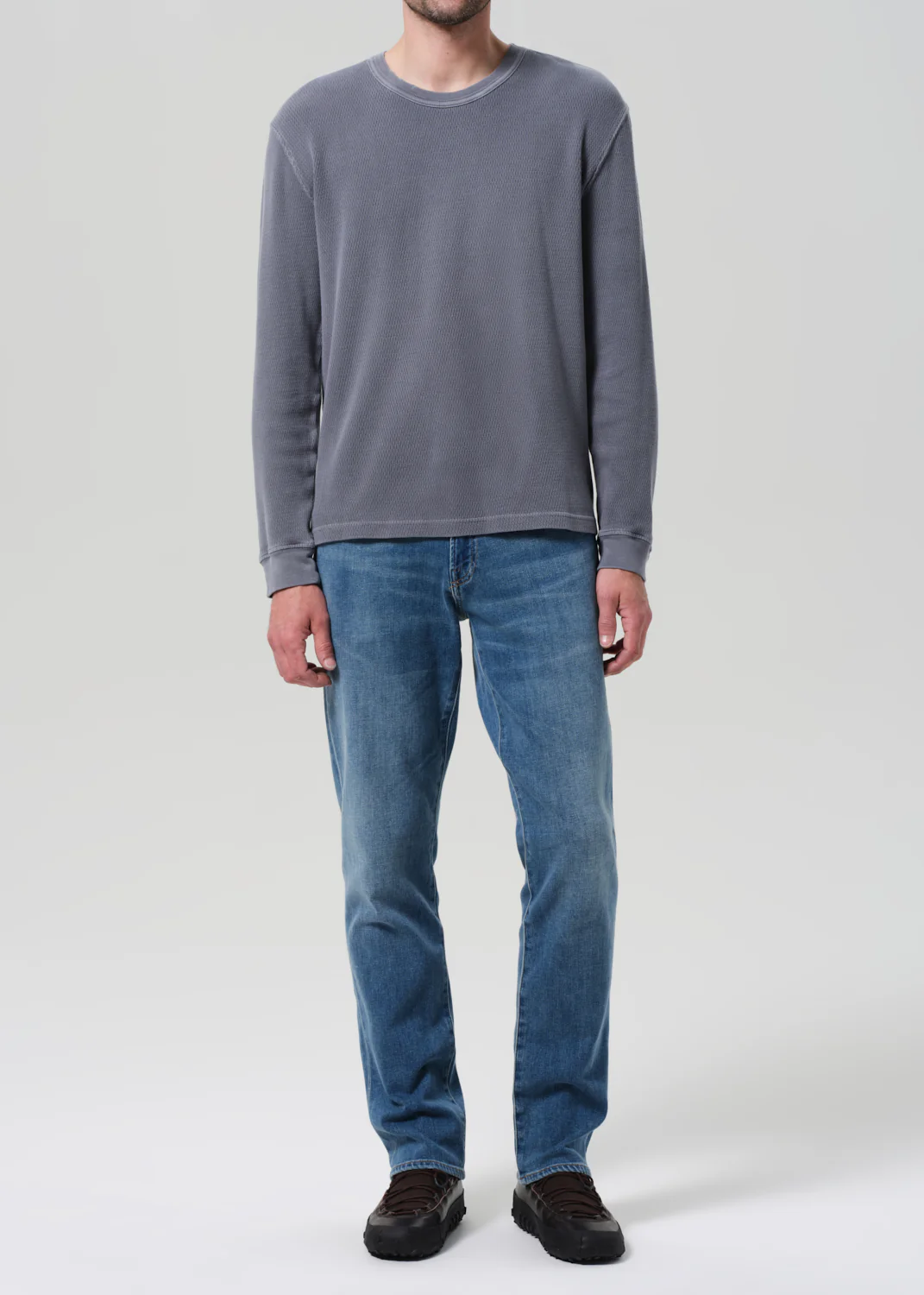 The Gage is a classic straight-leg fit with a mid rise and clean, refined silhouette. This pair is crafted from our signature Perform denim, blended with cashmere for a remarkably soft hand and elevated comfort. Finished in a medium-light indigo wash with subtle fading, marbling, and whiskering for a lived-in look.
