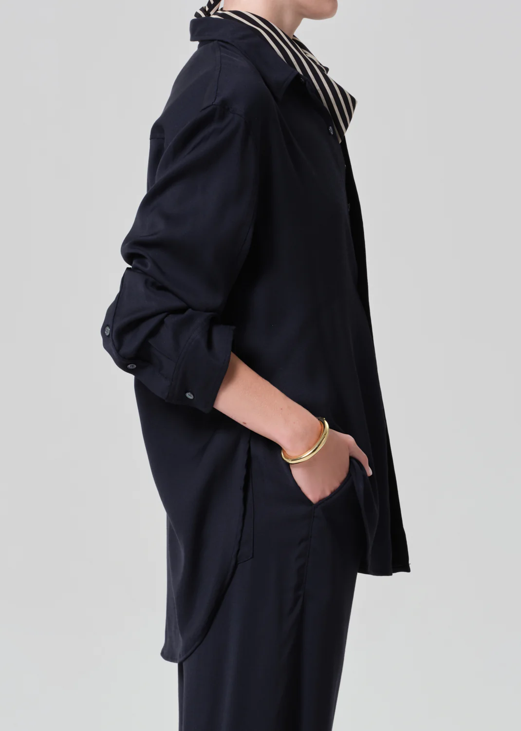 A timeless staple reimagined in luxurious Italian twill. The Kayla Shirt features a relaxed silhouette with long sleeves and an effortless drape that moves with you. The fabric’s smooth finish and gentle sheen elevate its laid-back shape, offering a look that’s both polished and understated. Perfect styled tucked, layered, or left loose for everyday versatility.