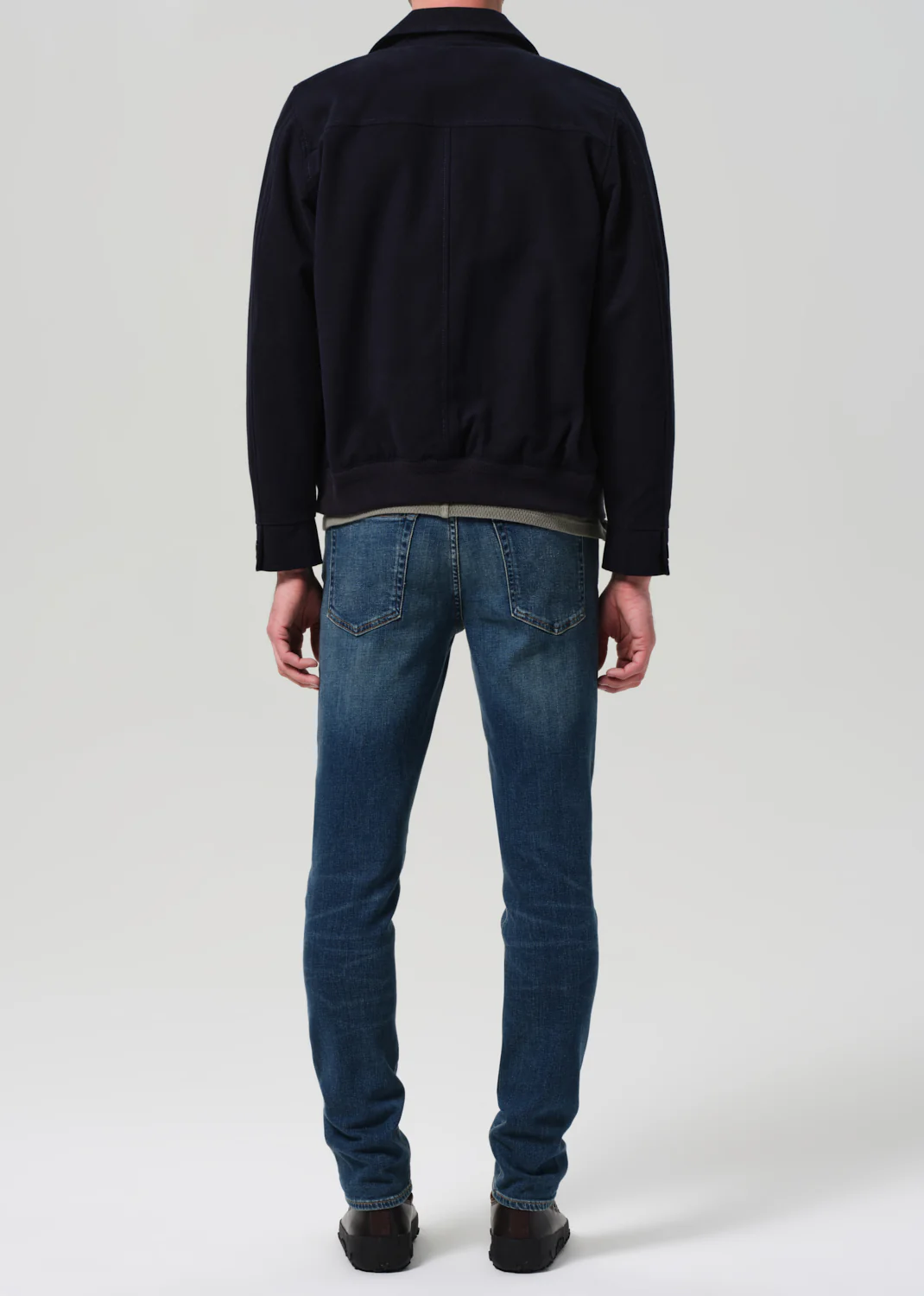 The ‘London’ is a modern slim taper, cut from cashmere-infused Perform denim for a uniquely soft, flexible feel. The silhouette fits clean through the thigh and narrows toward the ankle for a streamlined look. Finished in a medium-dark indigo wash with subtle fading and whiskering—easy to dress up or down.