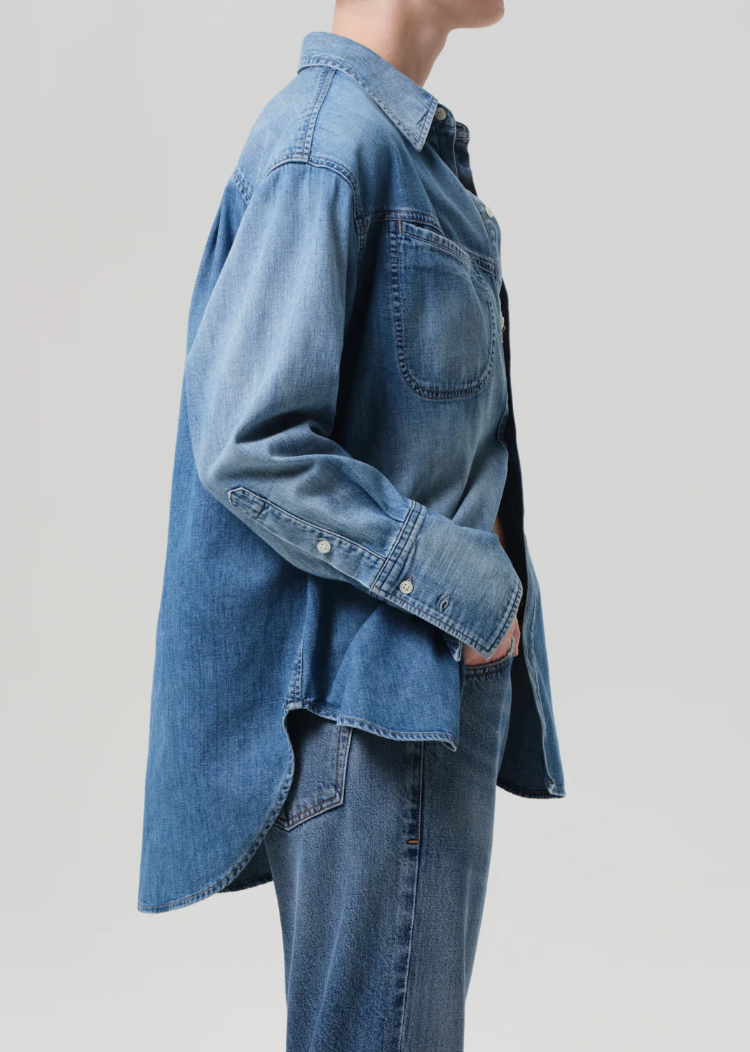 Looks Like: Medium to light indigo denim long sleeve shirt