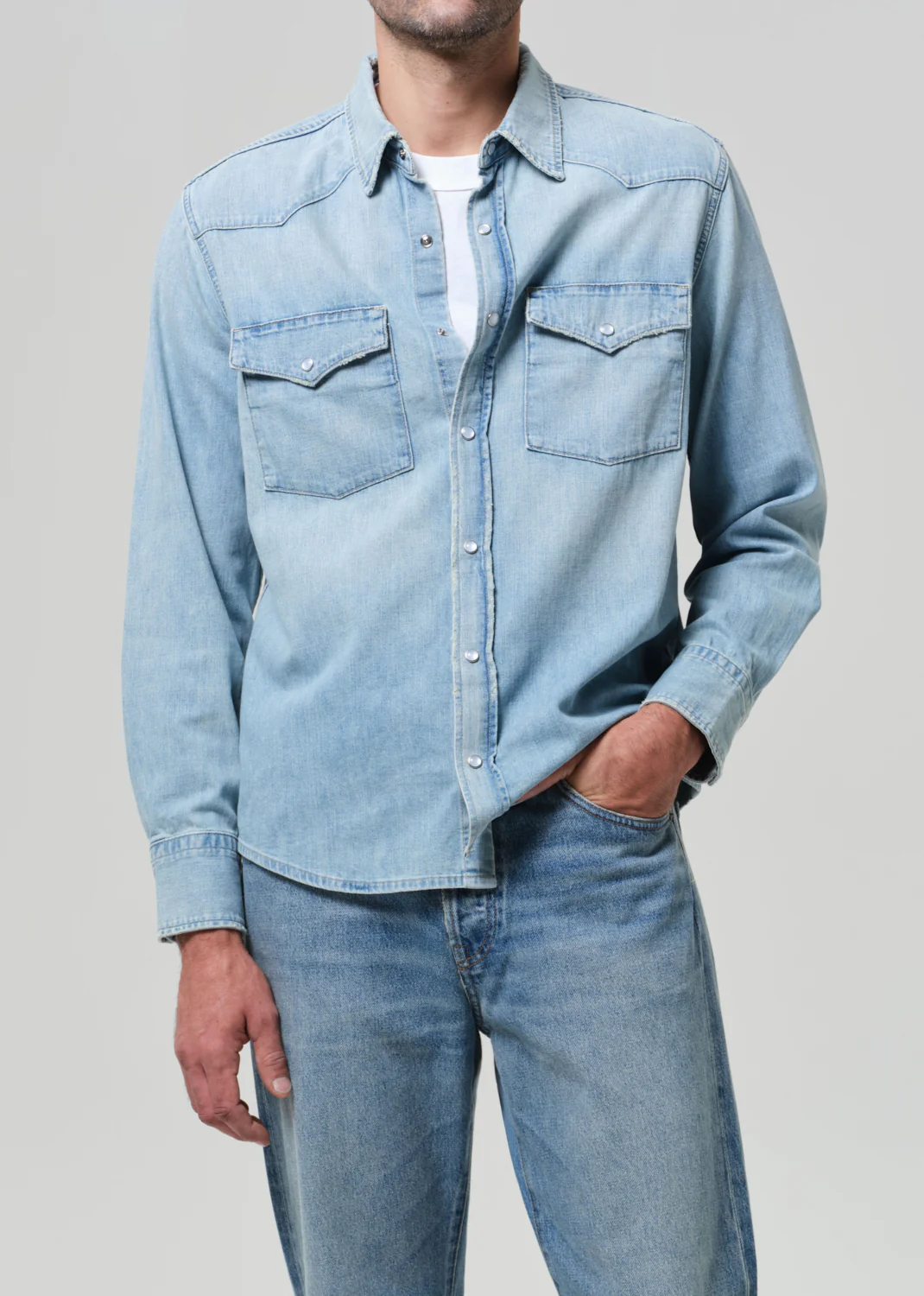 The Western Shirt is a heritage-inspired essential that reimagines a timeless silhouette with a refined perspective. Detailed with western yokes, snap-front closures, and dual chest pockets, it reflects the craftsmanship and character of true denim tradition. Part of our Premium Vintage Collection, it’s crafted from European and Japanese denim with slight stretch for ease and comfort. Finished in subtly washed tones, it embodies authenticity, craftsmanship, and modern ease.